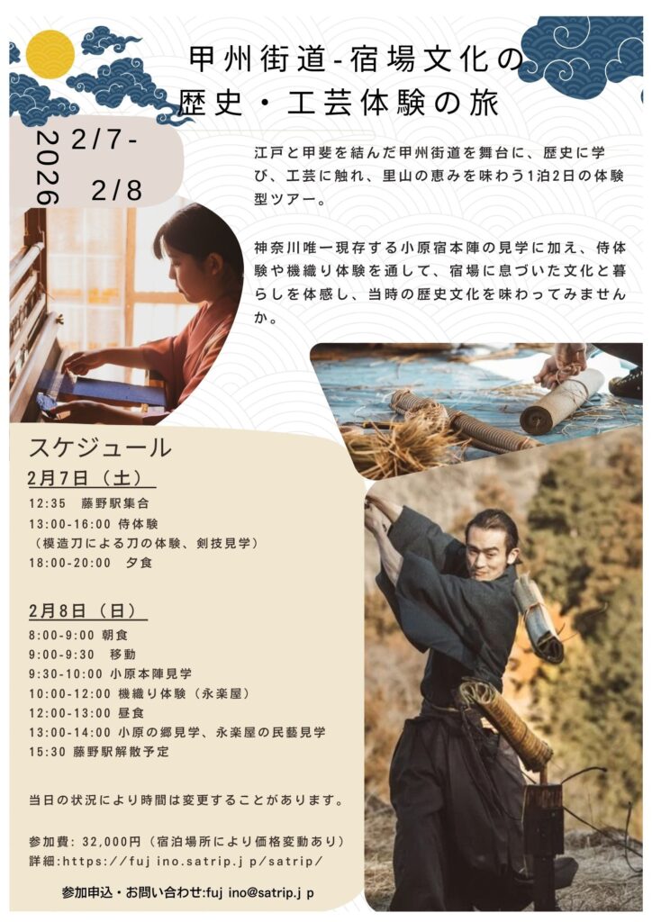 神奈川県相模原市緑区には、甲州街道の宿場町が、四ヶ宿あります。神奈川唯一現存する小原宿本陣の見学に加え、侍体験や機織り体験を通して、宿場に息づいた文化と暮らしを体感します。高尾山からほど近い里山に位置し、日本の精神文化や手しごと、静かな里山時間を深く味わえる滞在型の旅になっています。