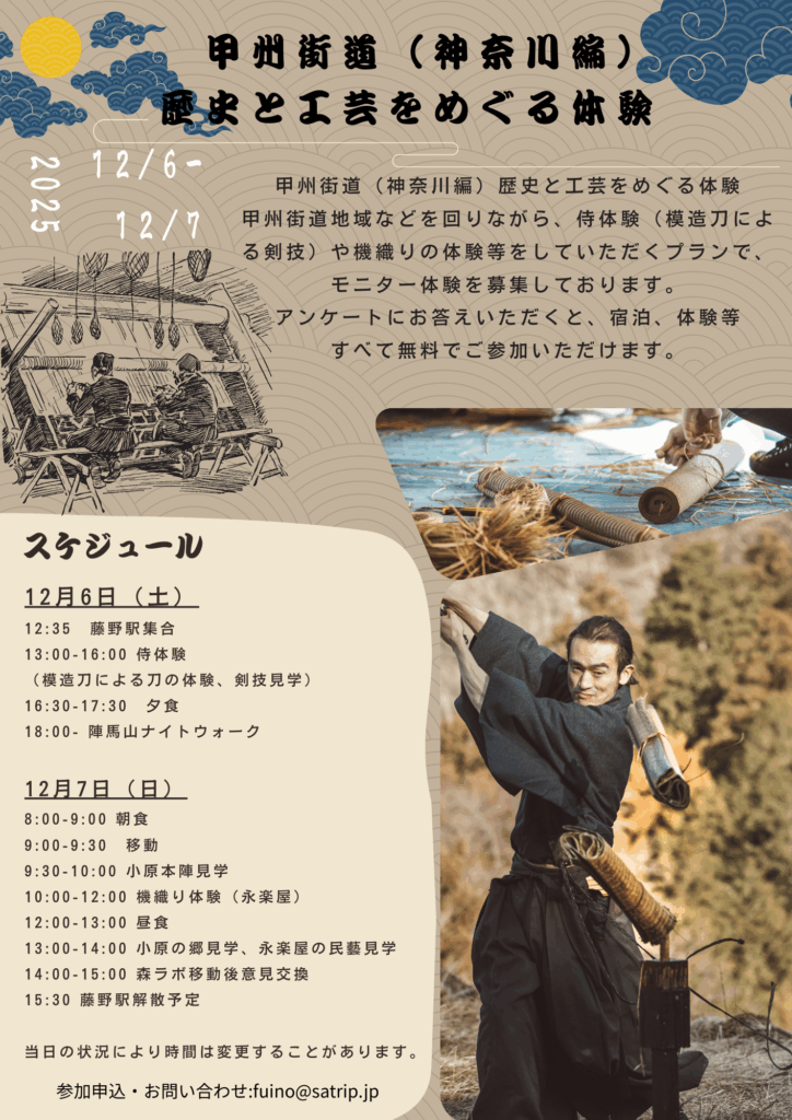 甲州街道地域などを回りながら、侍体験(模造刀による剣技)や機織りの体験等をしていただくプランで、モニター体験を募集しております。アンケートにお答えいただくと、宿泊、体験等すべて無料でご参加いただけます。